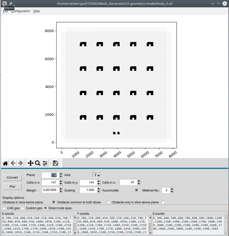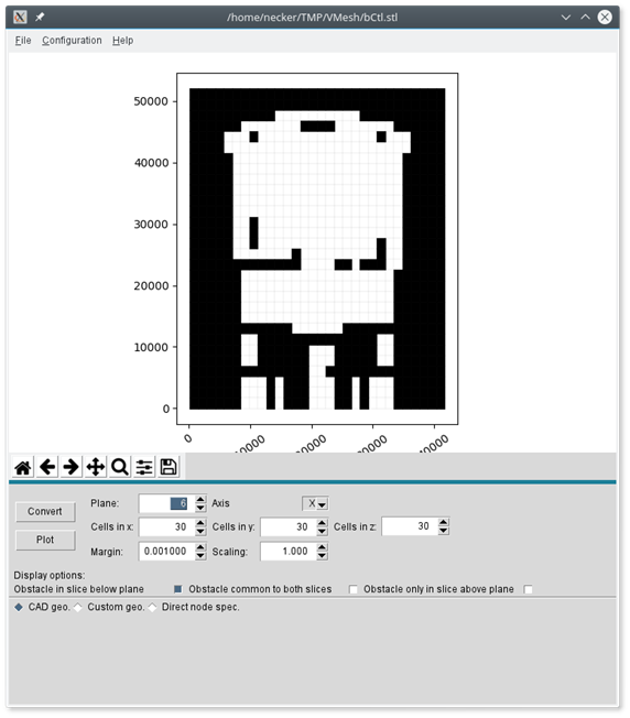 If a \_**STL** \_ file is opened using the file menu, below a big blank area a window with two command buttons, **Convert** and **Plot**, will show up. The various parameters to the right of the buttons and below can be used to select the mesh cut for display and to tailor the conversion process.The **Plane** and **Axis** controls select the mesh cut. The 3 **Cells** input fields select the number of cells of the generated mesh in each coordinate direction. The **Margin** input field sets a special parameter for the conversion process. The **Scaling** can be used to convert between the dimension units of the *STL* file and GASFLOW-MPI. The **Display** options can be used to select which items should be displayed.The 3 radio buttons below select 3 different mesh conversion procedures: