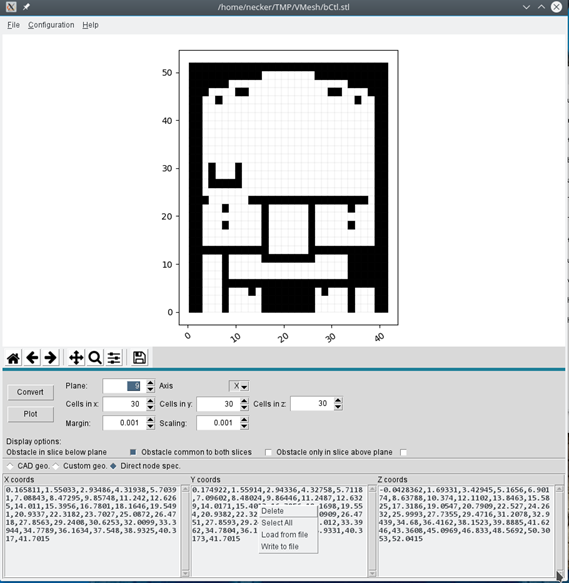 * **Direct node spec**. allows to directly specify the node locations of the generated grid. If the grid generated by **CAD geo** is used as a starting point, some adjustments to the node locations have to be done if the **Margin** parameter is too small. The values in the **X,Y,Z** coords text input areas can be saved as individual text files using the context menu (right mouse button click). In addition copy and paste work too, but only if the text input area is active.